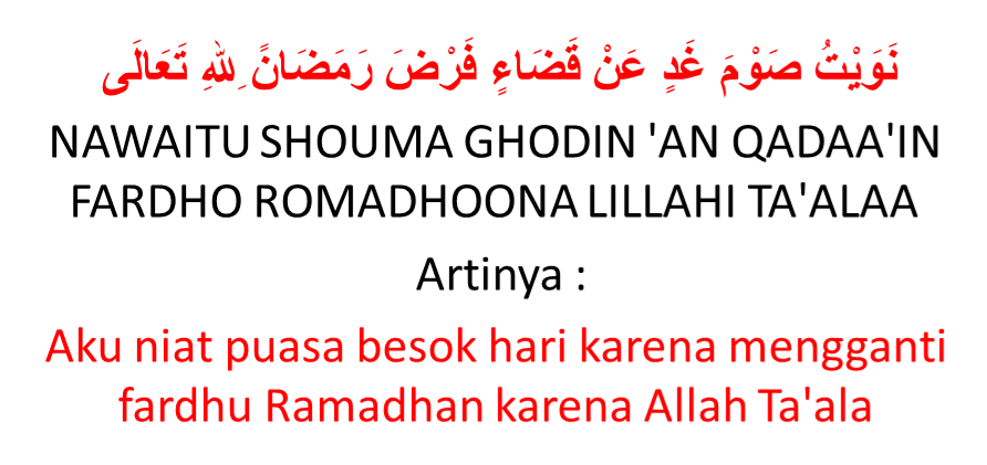 Sedangkan untuk niat qadha puasa ramadan, hal itu tergolong wajib sehingga harus menentukan jenis puasa qodho; Doa niat mandi puasa ramadhan, niat mandi bulan puasa, keramas puasa ramadhan. Niat, dan menahan diri dari segala yang membatalkan puasa1. Sahaja aku berniat puasa esok hari enam hari syawal kerana allah ta'ala. Puasa daud merupakan puasa sunnah terbaik.