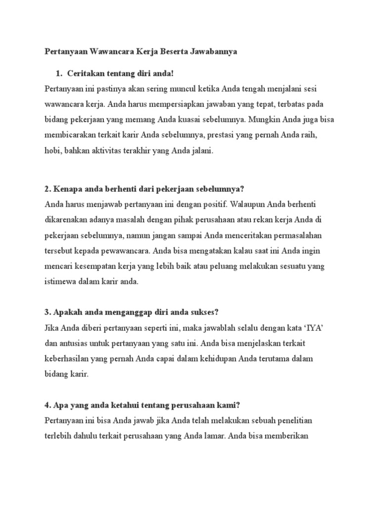 Documents similar to contoh pertanyaan interview kerja beserta jawaban. Jawaban dan pertanyaan interview untuk posisi hrd. 24 contoh pertanyaan dan jawaban wawancara lowongan kerja (job interview) 2018 berikut ini, bagus untuk panduan tips cara sukses tekankan keunggulan perusahaan dan minat terhadap hal tersebut. Cermati daftar pertanyaan interview yang sering diajukan. Maybe you would like to learn more about one of these?.